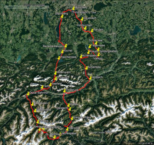 Morgens noch etwas Nieselregen | Durch das liebliche Würmtal| Am Ostufer des Starnberger Sees entlang | König Ludwigs Todesort | Jörg der Katzenflüsterer in der Fischhütte Sebald| Strandcafe in Seeshaupt leider heute geschlossen | Mittagessen im Gasthaus Schöntag | Unsere verdreckten Bikes | Versteckte Osterseen | Biergartenstopp in Benediktbeuren | Hostel in Kochel am See | 2-stündiger Zwangsstopp am Pass zum Walchensee wegen strömenden Regen | Voll die Sonne in Mittenwald | Ab ins Inntal | Nettes Hotel in Ötztal-Bahnhof | Der Ötztal-Radweg ohne Verkehr aber öfters hoch und runter| Tolle Unterkunft "Dorf Alm" in Obergurgl | 11 Kehren zum Timmelsjoch | Timmelsjoch leider voll in den Wolken | Abfahrt auf der italienischen Seite nach San Leonardo | Deftiges Abendessen beim Brückenwirt | Hoch zum Jaufenpass bei schönem Wetter | Tolle Jaufenalm kurz vor dem Pass | Nervige Motorradfahrer am Pass | Sterzing voller Touristen | Auf der Bahntrasse hoch zum Brenner | Übernachtung am Brenner-Pass - hier Abends nichts los | Angenehme Abfahrt auf der alten Brennerpass-Straße nach Innsbruck | Fest auf dem Marktplatz in Innsbruck | Absolut bissige Steigung von Jenbach hoch zum Achensee | Voller Achensee - ohne freie Unterkünfte | Über den Achenpass und immer noch keine Unterkunft | Tolle gechillte Fahrt durch tolle Landschaft bis nach Kreuth | Endlich: Zimmer im Gasthaus Gottfried in Kreuth | Schnell vorbei am Tegernsee und die Mautstraße hoch ins Valepp | Tolle Naturlandschaft im Valepp-Tal | Buttermilch in der Alber-Link-Hütte | Romantischer Spitzingsee | Vom Spitzingsattel kräftig runter zum Schliersee | Von Hausham bis nach Weyarn auf Radwegen durch die Wälder | Auf dem Bahnlinien-Radweg von Sauerlach bis nach München | Letzter Biergartenstopp vor München: Die Kugleralm.