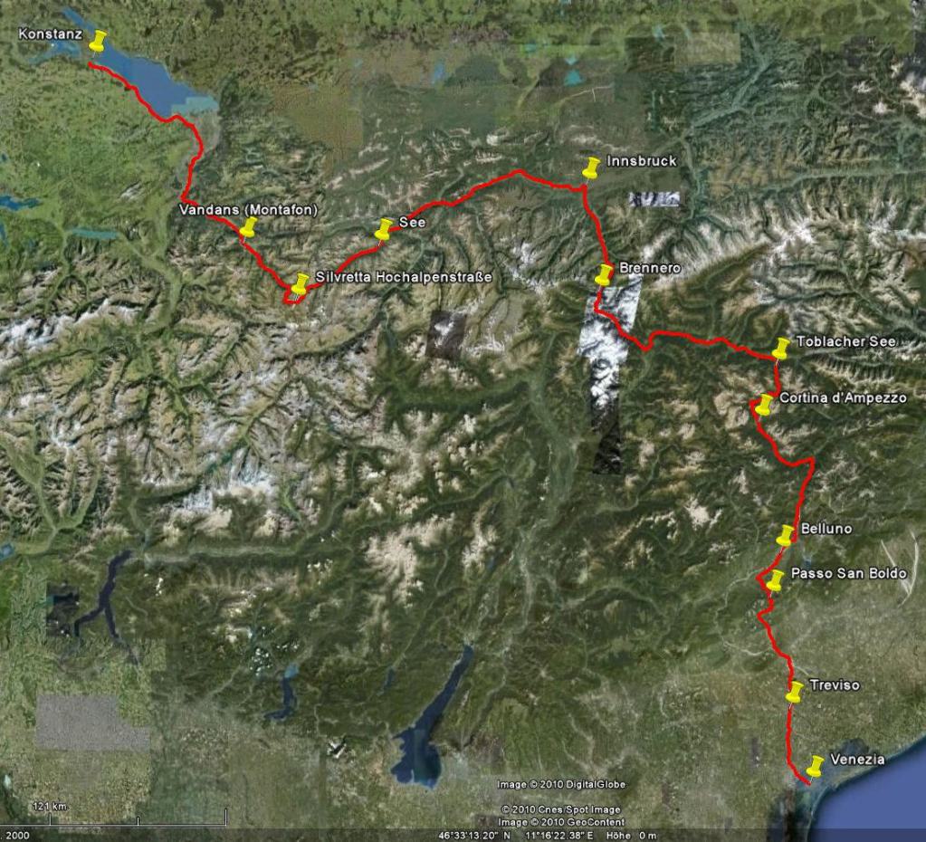 Frühstück bei Hundertwasser | Dorffest in Vandans | Die Bielerhöhe fordert sein Tribut | Gemütlicher Innradweg | Über den Dächern von Innsbruck | Frisch geteert am Brennero | Romantisches Pustatal | Stilvolles Übernachten am Toblacher See | Alte Bahntrasse bis Calalzo di Cadore | Belluno – italienisches Flair | Die Tunnels vom Passo San Boldo | Nachmittagshitze in Treviso | Die Helden in Venezia.