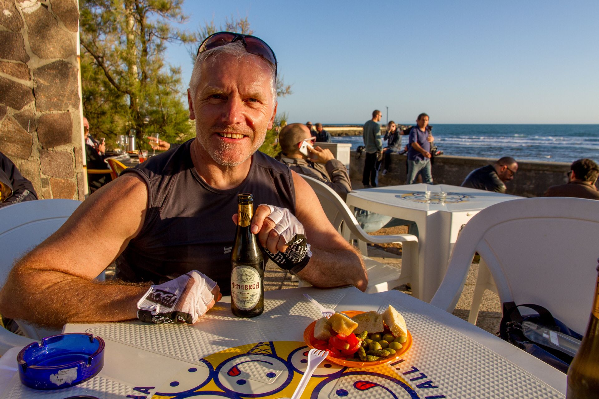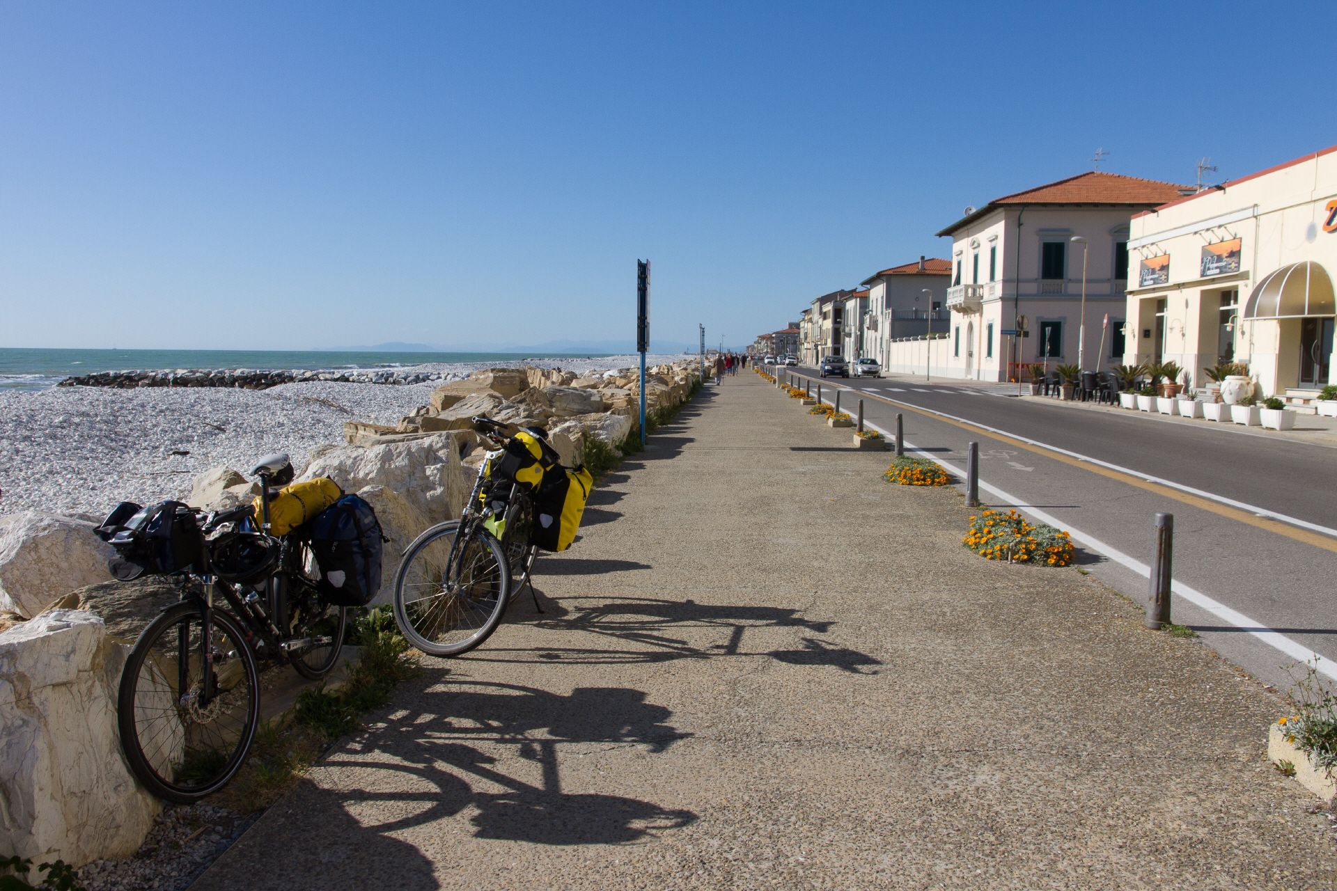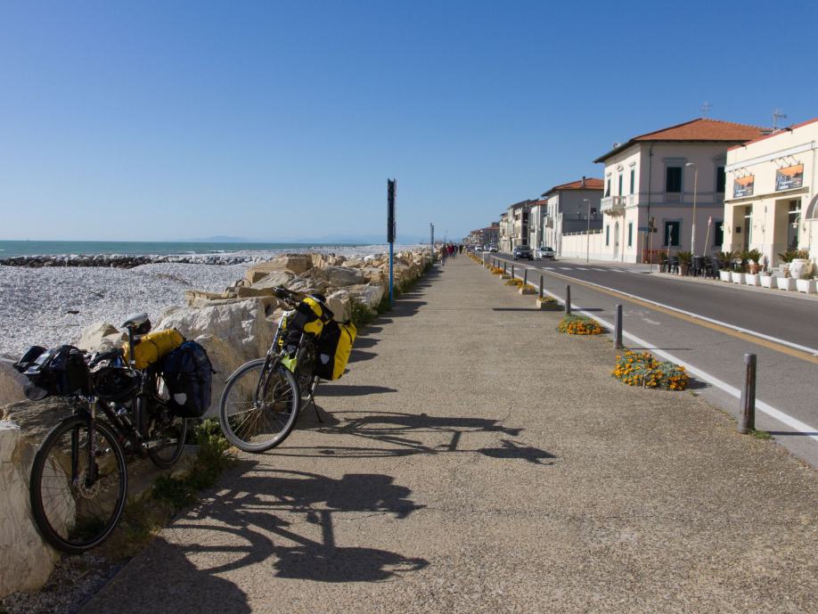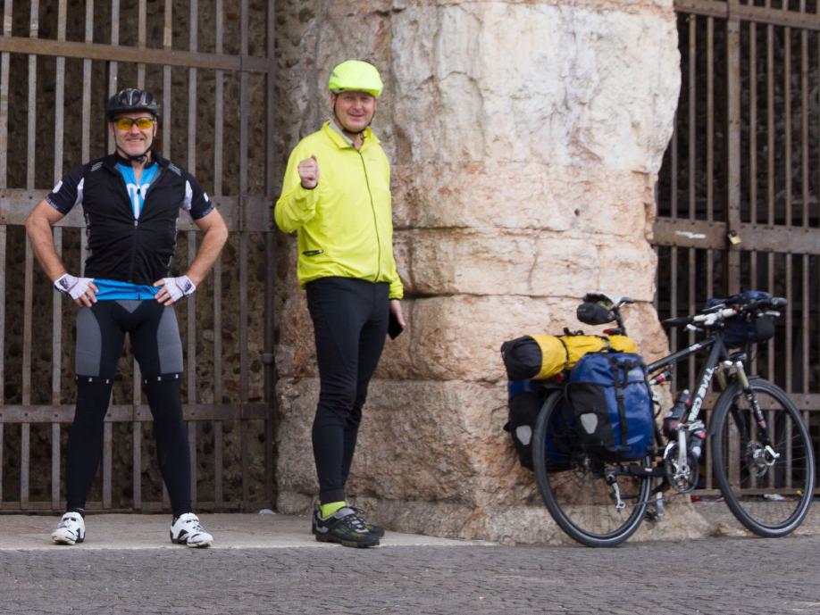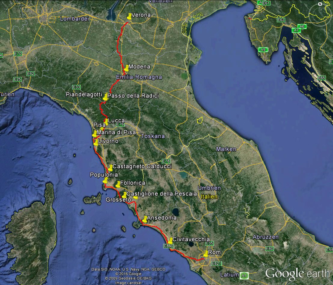 Schaltungsjustage nach der Zugfahrt München Verona | Markt an der Arena in Verona | Sommerlicher Abend in Verona | Dank GPS tolle Radwege aus Verona | Coole Herberge in Modena | Modena - die Stadt ohne Restaurants? | Auffahrt in den Appenin - jetzt wird's ruhiger | Einzigste Gäste in der Albergo vor dem Pass | Kalte Abfahrt vom Passo della Radici | Viel Trubel im warmen Lucca | Marina di Pisa - Jörg`s Urlaubsort | Sehen und gesehen werden - Radler und Jogger an der südlichen Strandpromenade von Livorno | Leerer Zeltplatz bei Livorno - die Suche nach der Pizza | Radeln durch die Maremma - ein Traum | Mittagessen in Castagneto Carducci | Moretti in Populonia | Ohne Touristen in Castiglione | Ansedonia - wenn man es sich leisten kann | Lebendige Hafenstadt Civitavecchia | Alle Wege führen nach Rom - nur für Radler ist die Einfahrt nach Rom hügelig und stressig | Das Finale vor dem Vatikan und dem Kolosseum | Enge Hotels | Sightseeing an einem Tag | Tolle Rückfahrt mit dem CityNightLiner - das ist noch Bahnfahren.