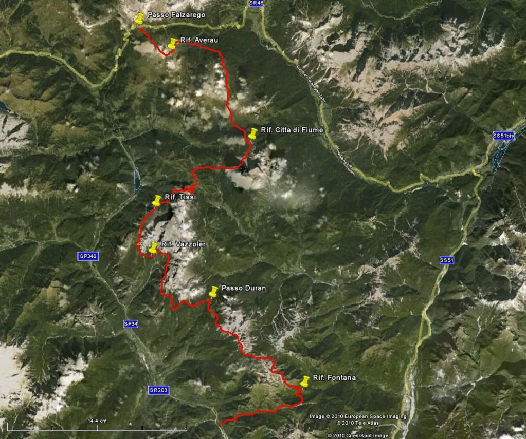 Leichter Regen am Falzarego | Gourmetessen auf der Rif. Averau | Rotwein mit dem Power-Wanderer auf der Tissi | Schneeeinbruch auf der Tissi | Vazzoler fast allein | Passo Duran: Kontakt mit dem 8000er-Hüttenwirt | Gewitter und Notunterkunft an der Malga la Rova | Rif. Fontana: Abendstimmung am Feuer | Schlechtwetter zwingt zum Abstieg.